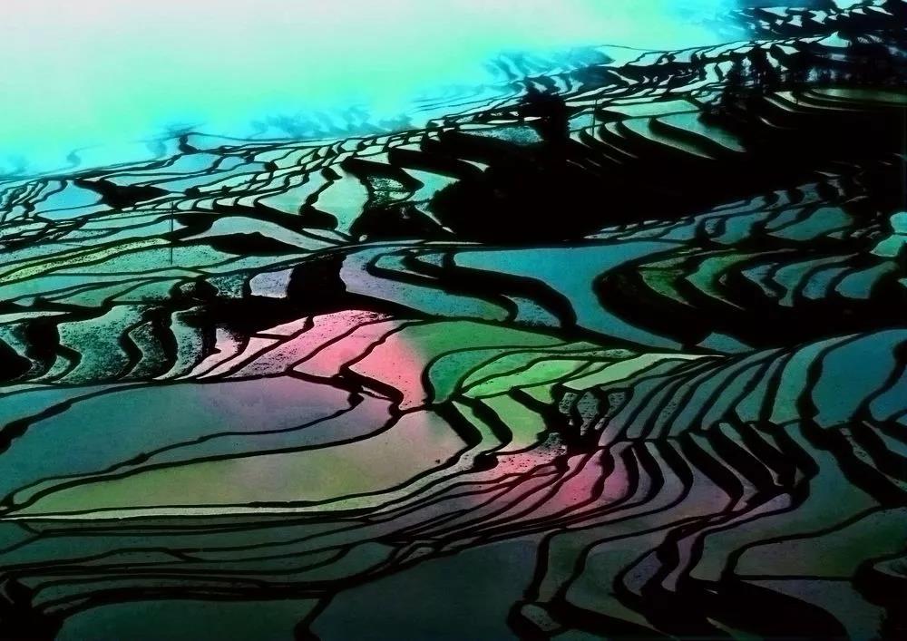 冬日里,灌水期的梯田層層疊疊,夕陽斜照,壯美異常。