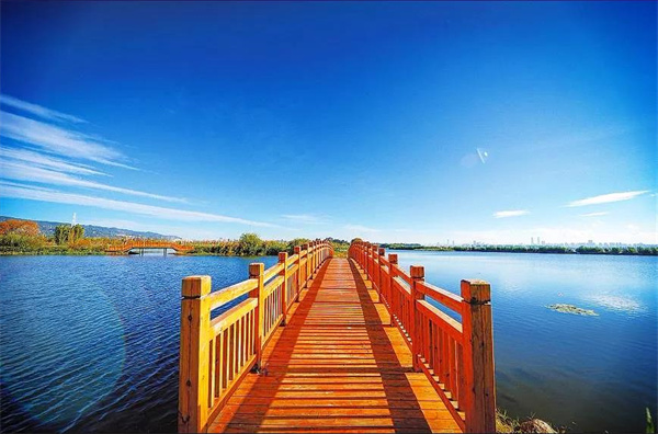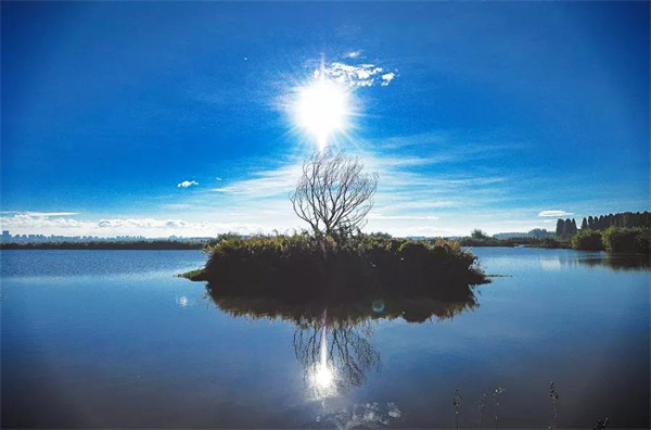 冬季的濕地有著自己的色彩,云影天光倒影在水面上,寂靜、空靈,別有一番韻味,微風(fēng)中徐徐搖曳的蘆葦,還有草叢中盛開的野花,交叉棧道蜿蜒在一片波光粼粼中,無不訴說著王家堆濕地冬季的故事。