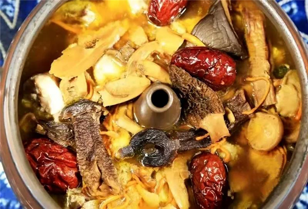 汽鍋是一種以陶為原料制作的鍋,它最妙就在于——以別致的結(jié)構(gòu),把“蒸”、“燉”這兩種傳統(tǒng)的烹飪方式巧妙地融合,發(fā)揮炊具最大的聚能效果,使得雞肉雞湯能夠被放大、最終呈現(xiàn)“本味”的特色。用極少的調(diào)味料,烹出“鮮”的味道,絕對(duì)是大多數(shù)人對(duì)汽鍋雞的第一印象。雞湯雖表面略帶油花,但喝起來(lái)卻不膩反而鮮美可口,在這寒風(fēng)瑟骨的冬天,來(lái)上一碗滋補(bǔ)暖胃是再好不過(guò)的了。