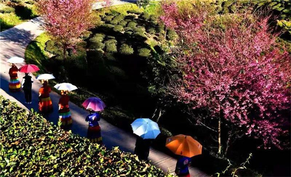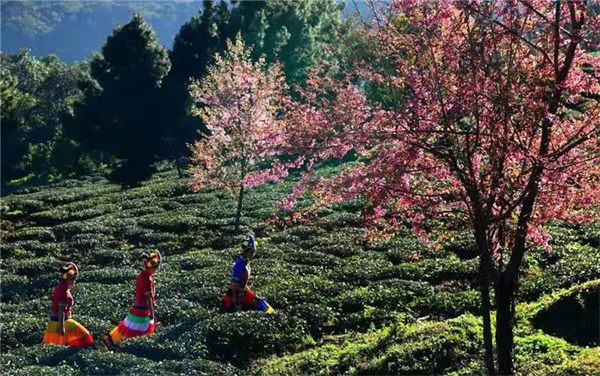 茶園、櫻花、遠(yuǎn)山,宛若一幅色彩斑斕的油畫(huà),滇中秘境最意外的春色悄然來(lái)臨。