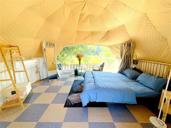露營基地共建有6個大帳篷,每個帳篷占地約56㎡,帳篷里配有空調、超軟大床、茶幾沙發、干濕分離淋浴房、衛生間、洗漱間等,帳篷前方還有高大落地窗,山野美景盡收眼底,最具特色的星空屋頂,躺在床上便可仰望璀璨星空。