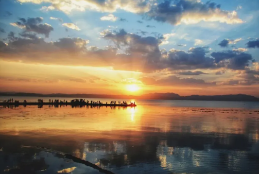 海晏村的日落被譽為昆明最美的夕陽觀賞地之一,吸引了大量游客前來打卡。觀賞地點分為兩個,一個是海晏村的碼頭,是觀賞夕陽落日的最佳地點之一。這里的地面鋪滿了小碎石,水邊種著高大的熱帶樹,樹下還有椅子供游客休息。從岸邊向水里建有一個長長的大堤,人們可以站在大堤上,近距離觀賞夕陽。另一個是村尾的滇池邊有一片小小的沙灘,這也是觀賞日落的絕佳位置。游客們可以在這里架設三腳架拍攝日落,以絕佳的觀賞視角將湖光山色盡收眼底。