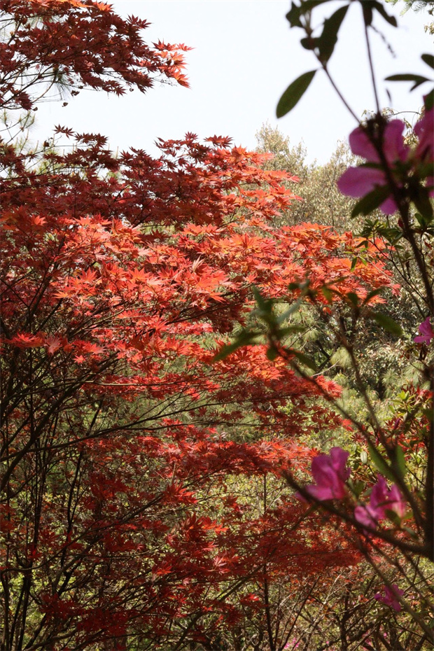 紅楓秘境在醞釀驚喜。新生的楓葉浸透了春日的陽(yáng)光,深淺不一的紅與蒼翠古木交織,史鐵生筆下“生的豪情”在此處具