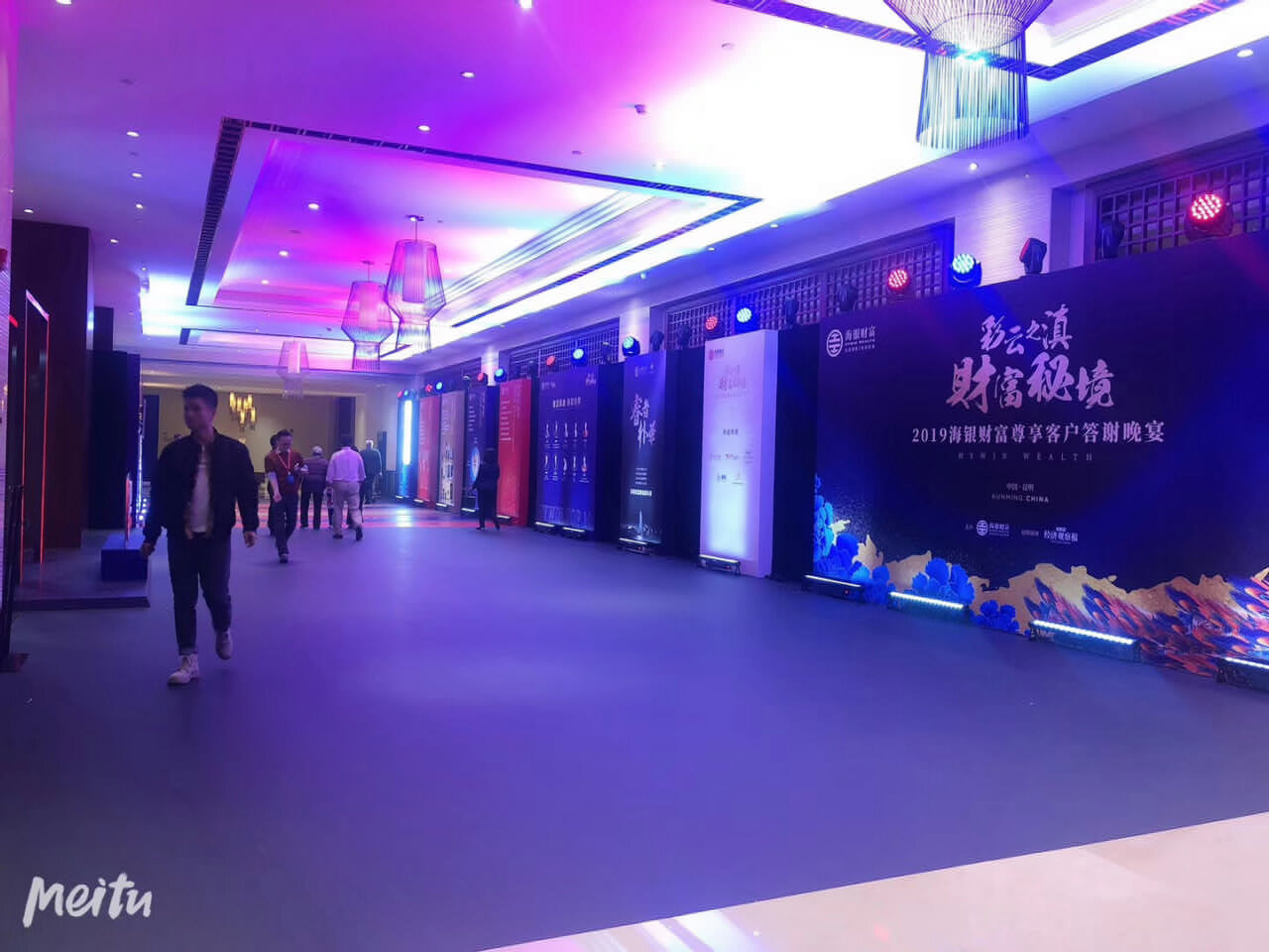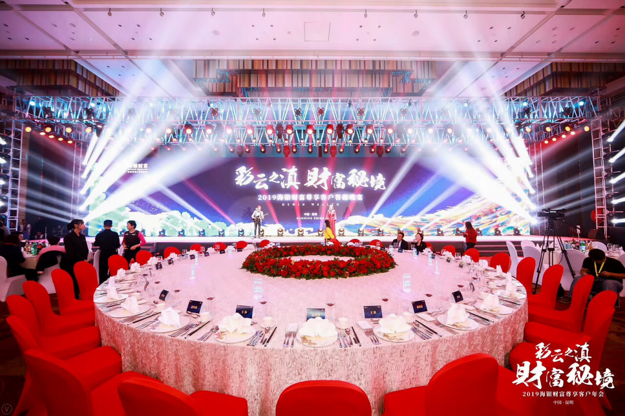 2019年海銀財富尊享客戶年會及答謝晚宴在滇池湖畔春城昆明召開;天行提供會議會展、獎勵旅游、市場活動管理及包括AV搭建、物料制作、活動場地、演藝、拓展、勞務人員等專項資源管理在內的專業會展服務。
