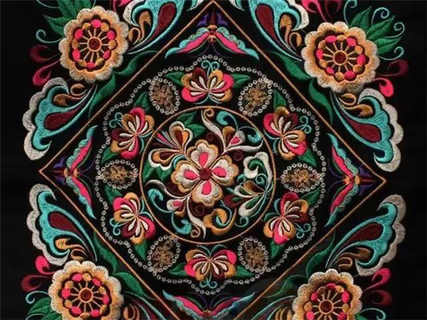 但無論哪一個“門派”,滇繡在色彩上都有一個相同點,那就是顏色慣用深色與暖色,以濃艷為主,色塊絢麗,構圖舒朗,呈現出粗獷質感、五彩斑斕、富于生命力的特點。對山川神靈的崇拜和自然人文的敬畏,融匯在一針一線間,成為地區內的文化符號。