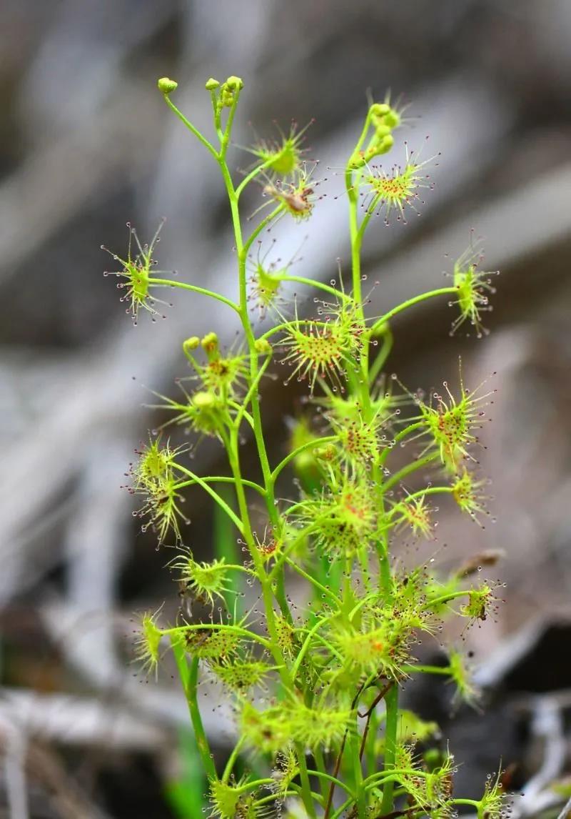 但茅膏菜也有其溫情的一面,它并不會對所有昆蟲“趕盡殺絕”。在它花期時,植株會抽出長長的花序軸,以免誤傷了授粉的昆蟲。為了保護給它授粉的昆蟲,才將花朵開在離葉子較遠的花莖上吧。但茅膏菜的花期很短,在深秋時分,為期數月的休眠之后,其花期只有短短幾個小時。