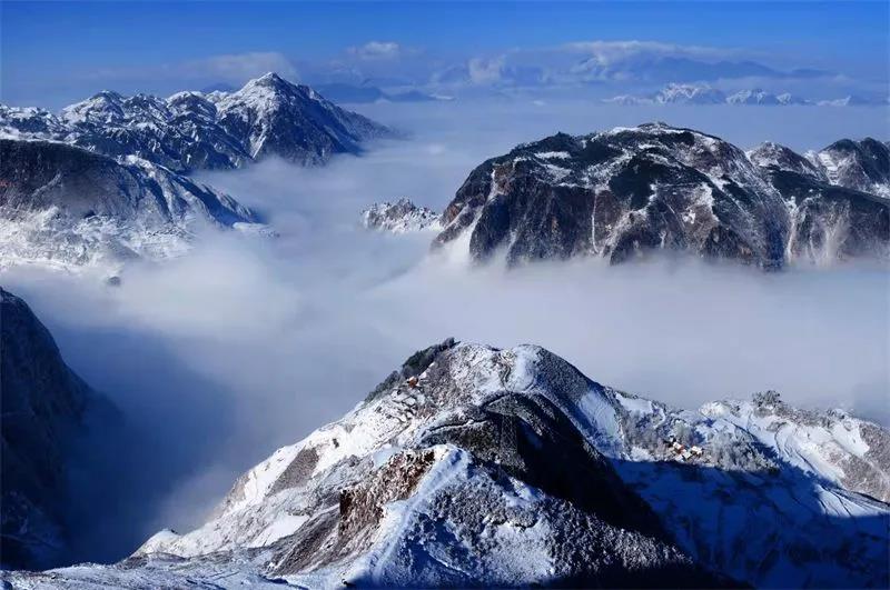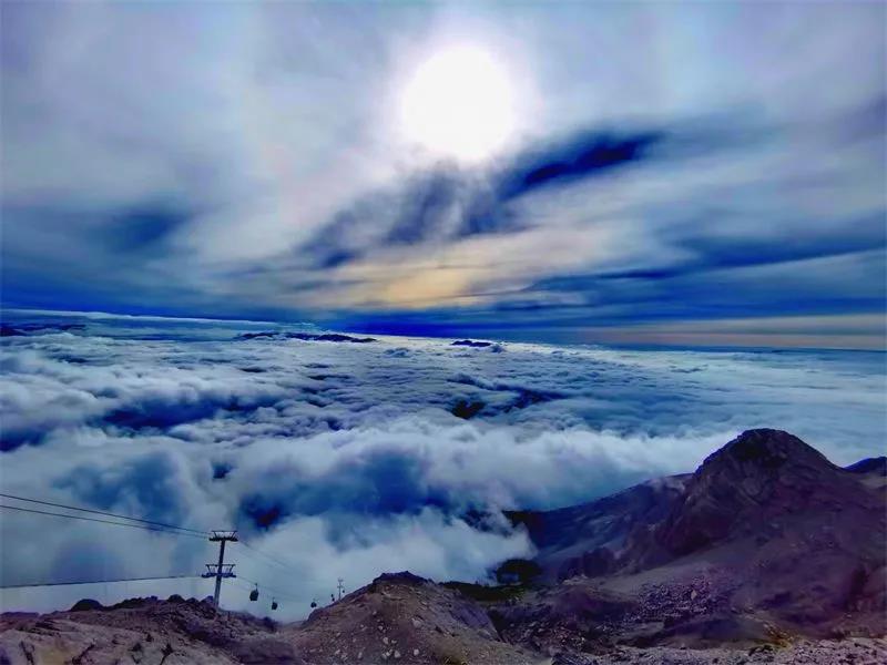 “靈山蓄云彩,紛郁出清晨。”轎子雪山常年云霧繚繞、紫氣升騰。那些云朵,或靜止于山谷,或橫睡于半腰,或涌動(dòng)于轎頂,變化萬千,山石如洗,空氣清新。遠(yuǎn)山如黛,云海奔流,時(shí)而上升,時(shí)而下墜,時(shí)而回旋,時(shí)而舒展,時(shí)而成群集結(jié)蔚然成海,任性翻涌。