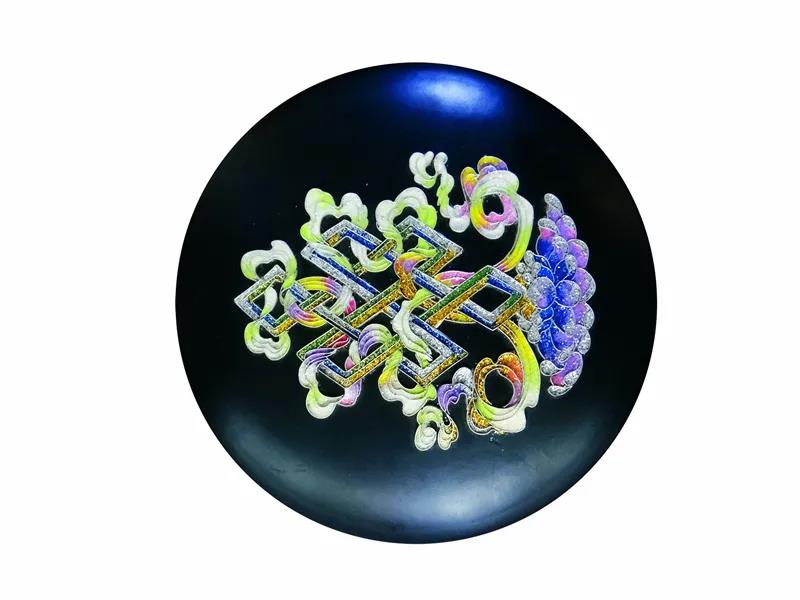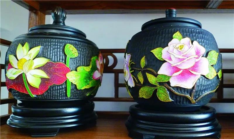 傳統(tǒng)的景泰藍(lán)制作工藝為:先描圖后掐絲,再上釉,后反復(fù)燒制,工序可達(dá)上百道。而云南掐絲彩嵌黑陶是將釉料燒制好研磨成細(xì)粉再掐絲作畫,將五彩艷麗的釉料粉鑲嵌在黑陶上,將原來的上百道工序簡化為十多道工序。成品具有防水、防腐,不易褪色的特點(diǎn)。