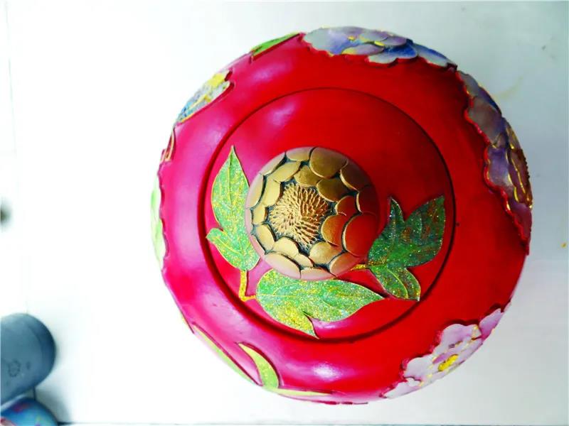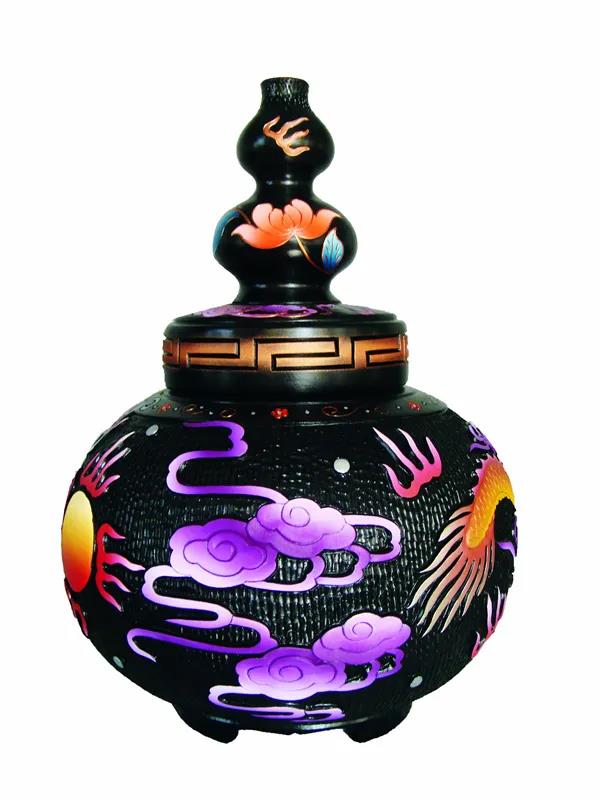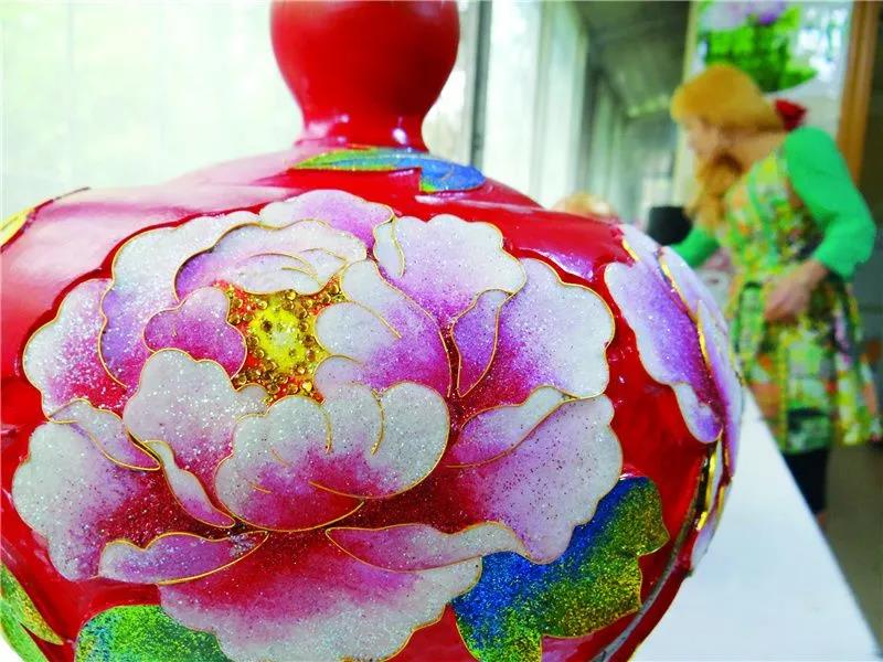 大紅的底色上,金絲勾勒出的數(shù)朵牡丹花嬌艷綻放,幾只蝴蝶在上面翩翩飛舞,點(diǎn)綴其間的金粉若隱若現(xiàn)。這是掐絲彩嵌黑陶工藝品“寶葫蘆”,由三個部分組合而成,聚寶盆寓意聚福聚財,中部和瓶頸組成的花瓶寓意平安。