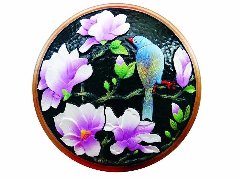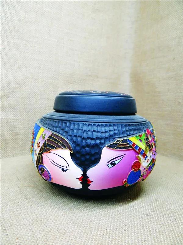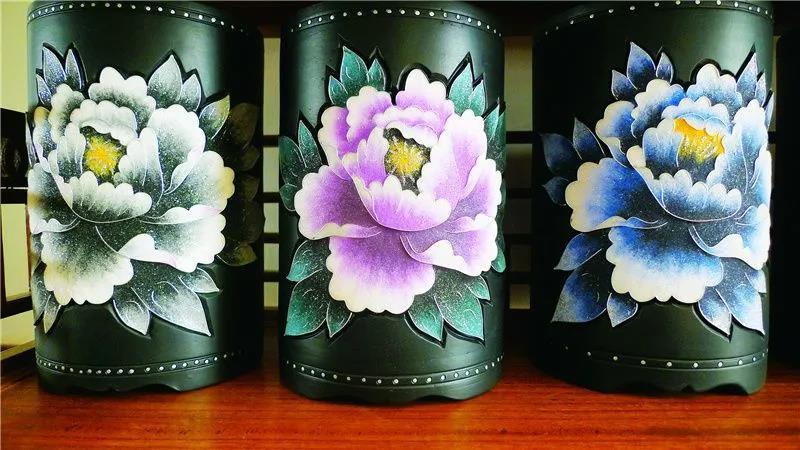 除掐絲彩嵌黑陶外,學(xué)習(xí)“云南畫派”畫家的黑陶彩繪系列產(chǎn)品,運(yùn)用了云南重彩畫工藝,用不浸水不褪色的丙烯顏料,在燒制成的半成品陶體上做畫,最終形成具有濃郁云南民族特色的黑陶重彩工藝品。