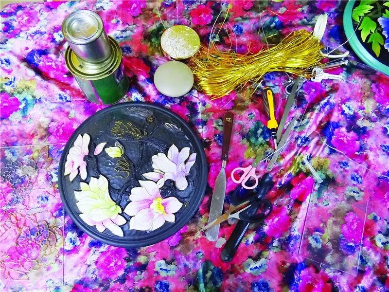 陳鴻斐對民族風(fēng)格外青睞,她的陶藝工坊里充滿了鮮活的色彩。除了艷麗的插花,所有的工作桌上都覆上了一層色彩繁復(fù)的印花絲織桌布,十分搶眼。“平時生活和大自然中從不缺少美,可以從中提煉出配色、用光的道理,包括放在家里的瓶花,大師的優(yōu)秀刺繡作品等各種藝術(shù)樣品都能帶來靈感,刺繡的顏色和過渡是我做陶經(jīng)常參考和借鑒的。”陳鴻斐說,她閑暇時候經(jīng)常觀察絲綢花面的光澤度和色彩搭配,桌面上的花朵圖案還能啟迪她作畫上色。