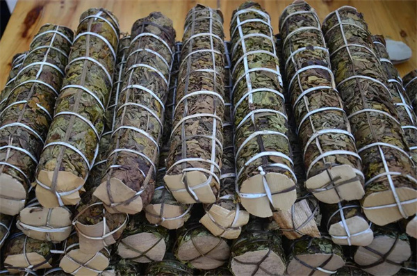 將回軟后的茶葉裝入竹筒中,用黃栗木杵舂壓造型,制成松緊適度的圓柱狀茶筒,一般規格為:筒長30-33cm左右,直徑5-6cm左右,重量約150-200g;圓柱形茶筒底部和上部用筍葉剪成與茶筒直徑大小相當的圓形小片作墊層,筒體用扎篾、青藤或葛麻藤交叉纏繞捆扎,然后干燥、包裝。